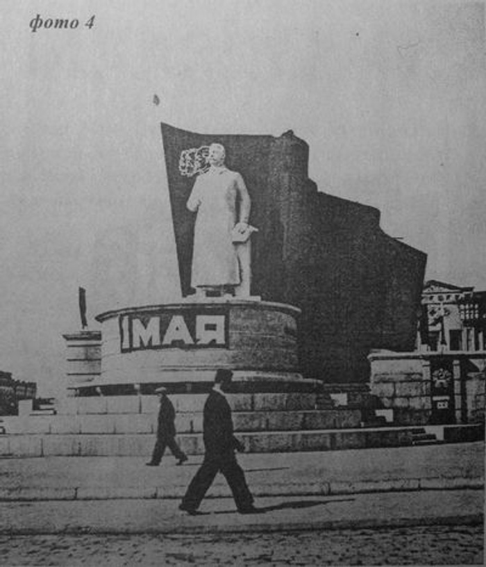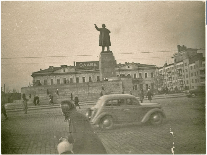С 1948 года на площади располагалась вот такая фигура Сталина. Неизвестно, был ли это «основательный» памятник, частичная реализация довоенного проекта парного памятника Ленину и Сталину или же временный гипсовый макет будущего памятника.