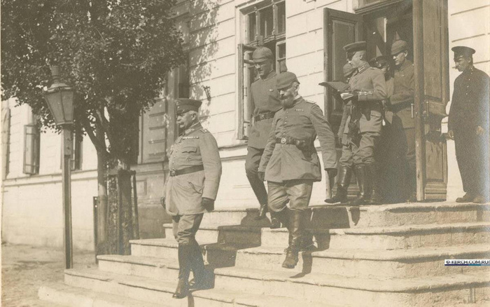Лето 1918 генерал фон Кош со свитой спускается по ступенькам из здания ж. д. вокзала г. Керчь: