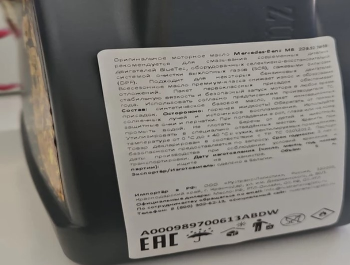 Кто покупал недавно масло MB 5w30, подскажите у вас тоже были такие наклейки на канистре. Дилер кто завозит указан рустранс логистик. Заранее спасибос за инфу