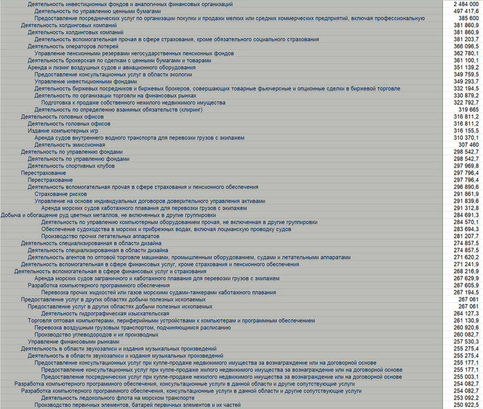 Но если углубиться, то всё становится гораздо ужаснее и печальнее. Полная разбивка по ОКВЭДам содержит в себе 2524 позиции. Там частично может повторятся, когда идет спуск по иерархии, ну да ладно. Вот, смотрите: код 66 «Деятельность вспомогательная в сфере финансов и страхования». И да, средняя номинальная начисленная заработная плата работников организаций (без субъектов малого предпринимательства) составила в ноябре 198 178 ₽.