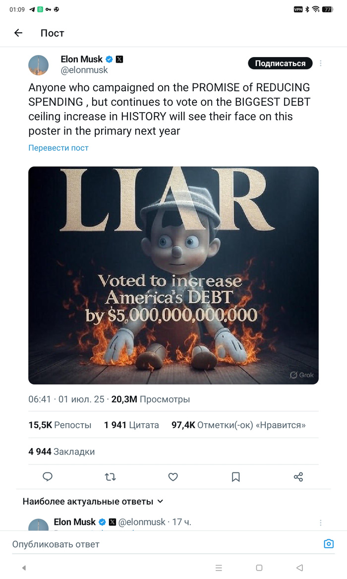 Илон Маск против буратин, голосующих за билль Трампа о расходах и налогах, который приведёт к увеличению потолка госдолга США ещё на пять трюликов