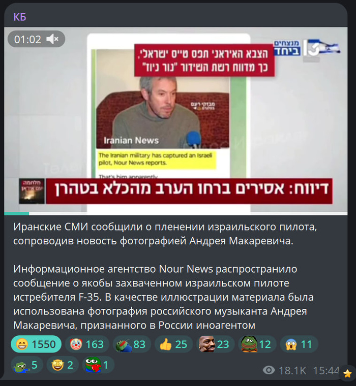 Информационное агентство Nour News распространило сообщение о якобы захваченном израильском пилоте истребителя F-35. В качестве иллюстрации материала была использована фотография российского музыканта Андрея Макаревича, признанного в России иноагентом