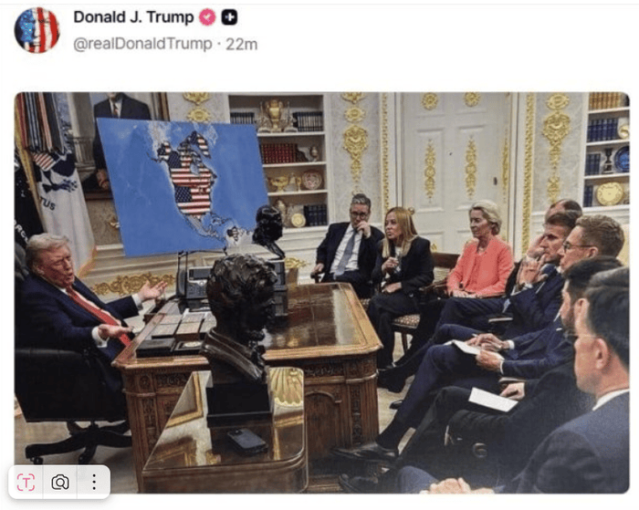 В принципе такие планы США даже и не скрывают, а хвастливый Трамп уже открыто демонстрирует "новую карту США" с Канадой и Гренландией: