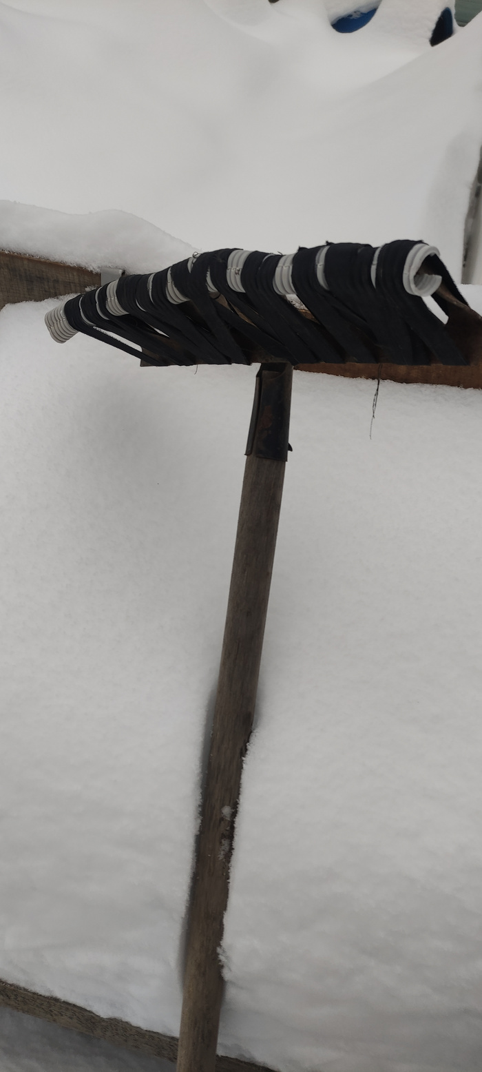 Я вот какую штуковину соорудила из граблей для стряхивания снега с теплиц