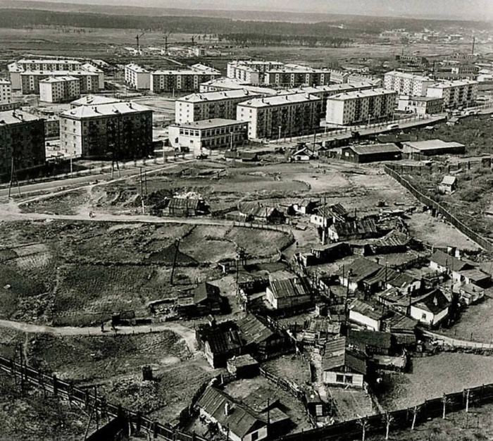 я помню эти бараки, иногда мимо них ходили в детскую поликлинику. Фото примерно до 1977 года. Потому, что блочная пятиэтажка по Победы 42 уже есть, а четырнадцатиэтажки Победы 40.1 над бараком ещё не видать.