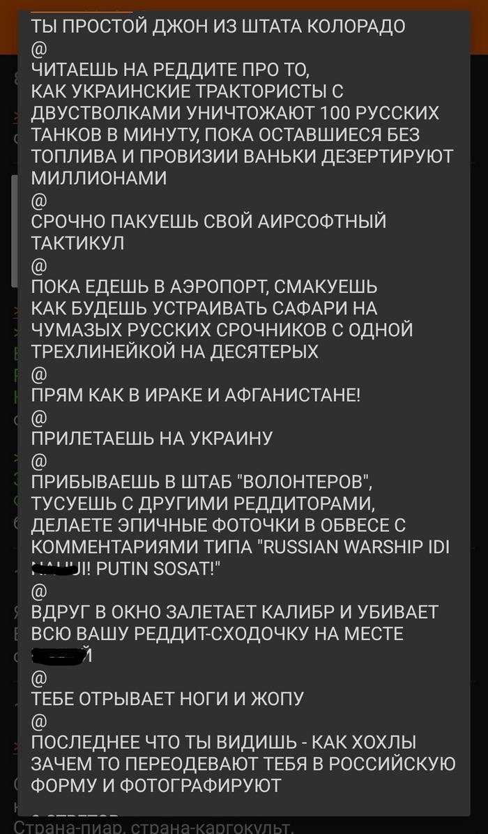 Скажу тогда я. Разных отставных (а может и не очень) рейнджеров, морских котиков и прочих САС, привыкших отстреливать в колониях аборигенов, до того эпично обнулили, что второй день льются слёзы выживших по соц.сетям и в репортажах СМИ. Представители прогрессивной общественности их пытаются как-то утешить, проявить солидарность, но предпочитают это делать дистанционно, потому что, конечно, запах обгаженных портков там стоит невыносимый. Пресса и творческая элита негодует, у них уже были заготовлены статьи и репортажи о том как бравые профессионалы ложат вшивые орды с востока тысячами с двух рук крупнокалиберными пулемётами и уже, конечно, было собирались реанимировать франшизу «Рембо» и вдруг такой обсёр. Теперь приходится все переписывать заново и сочинять истории о том как едва умеющих держать автомат волонтёров, приехавших со всего мира что бы нести мир или просто помогать беженцам, безжалостно разбомбил бесчеловечный режим. Получается оплата одна, а работу пришлось делать дважды, такого они России точно не простят.