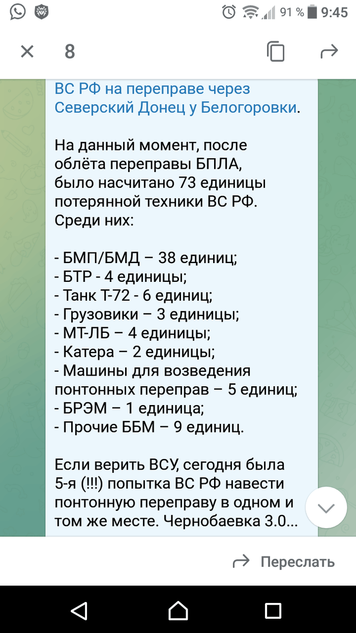Пишут, что под Белогоровкой всё очень грустно с переправой... 73 единицы техники