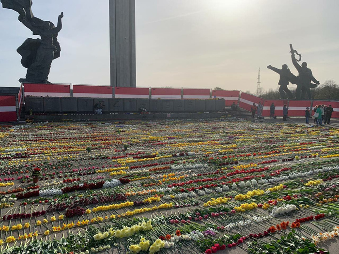 Сегодня утром, власти Риги сгребли трактором все цветы у монумента.