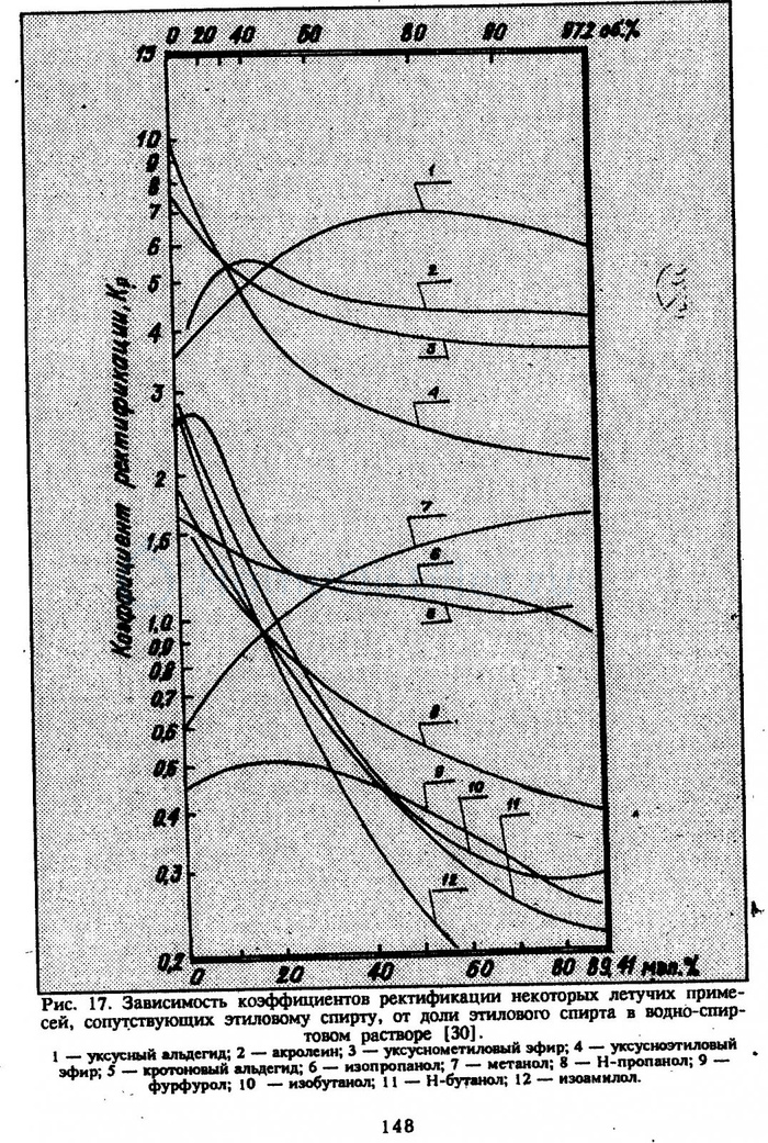 Соответственно, с крепости 85% до 68% (для температур кипения с 79 до 81), средний коэфф изоамилола 0.21. в 5 раз релется по формуле. В реале чуть больше ТК через пленочную а насадкой ему в паре тяжелее пройти при т кип около 110с. Грубо в 5 или более раз уменьшаем его концентрацию. Флегмой же отрезается слишком лишнее, резал я ею, в итоге получпл непонятно что дале стараясь обратку по минимуму включать.