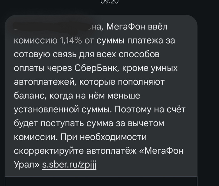 Доброе утро. Вот смс от сбера, что мегафон ввёл комиссию за все платежи кроме одного вида автоплатежей. В ЛК возможно тоже без комиссии, но мне удобнее с автоплатежами. Пропускаю только смс-ки от мегафон типа "мы добавили...теперь вы будете платить +дцать. Чтобы отказаться, пришлите до такого-то