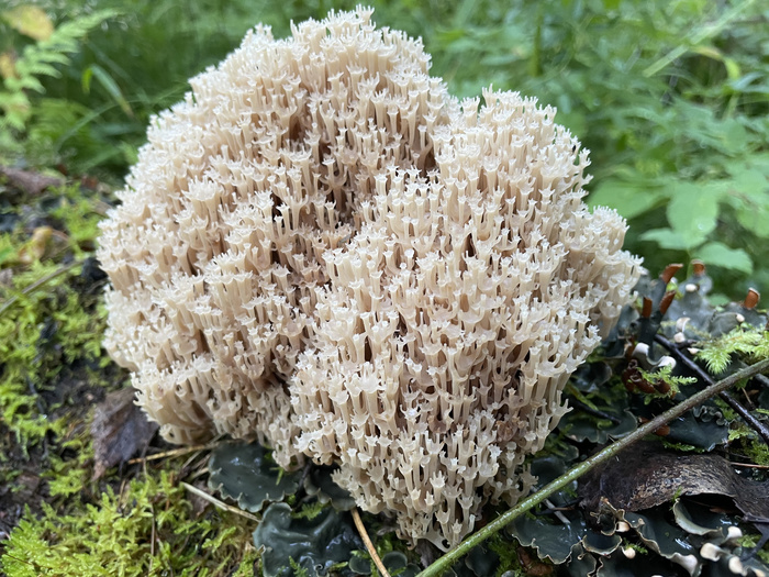 Из толстой белой «кочерыжки» вырастают многочисленные разветвлённые густые кустообразные ветки цилиндрической формы.