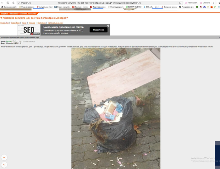 Вот пытаюсь понять: Три недели стоит посреди дороги мешок с листвой. Никому в голову не пришло его убрать. Какой-то тип почему-то решает, что мешок с мусором это пепельница. А когда свинье прямо говорят, что она свинья, так она ещё оскорблена оказывается до глубины души вместе со всей своей роднёй да ещё находятся те, кто встаёт на защиту свиньи и попрекает меня тем, что я аккуратный и того же от соседей требую