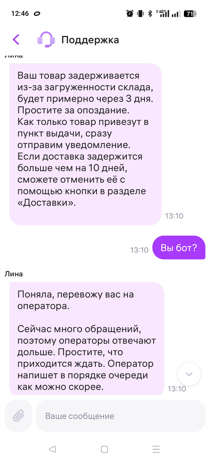 Было недавно. Ни разу человек не ответил. Это то же бот. Все время просили отменить доставку. Потом просто вернули деньги. Через месяц такой переписки. После этого решил там только носки и трусы можно покупать