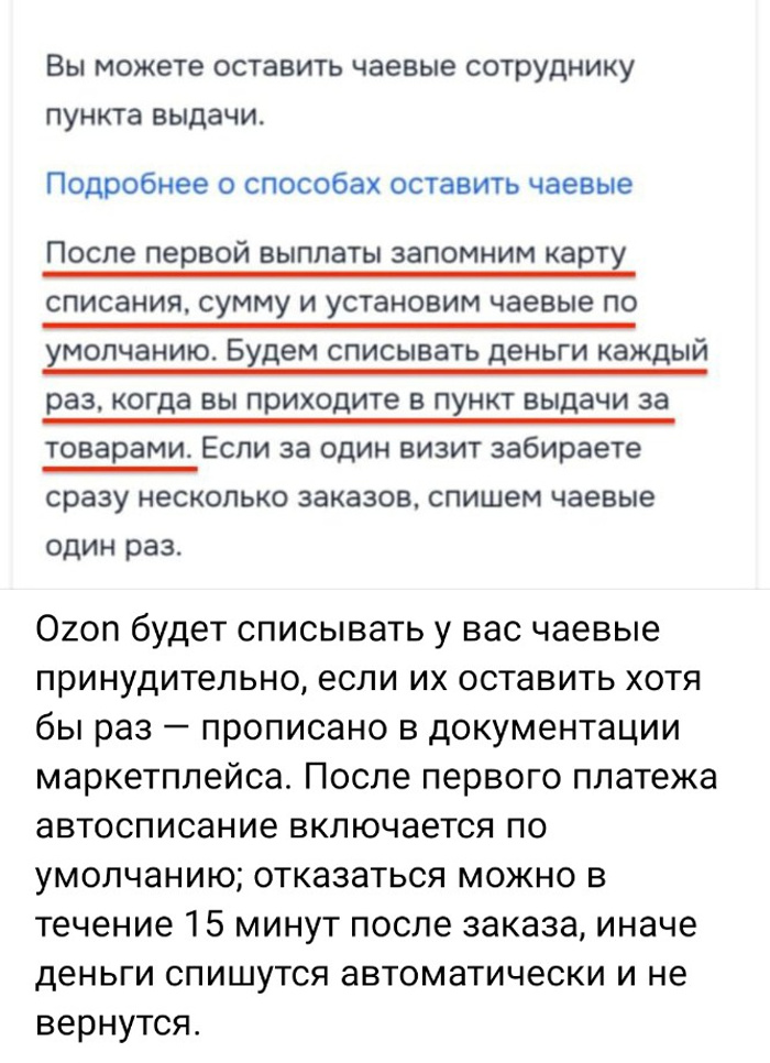 то что озон ввели чаевые да =) на моменте даже оформления заказа лезет это говно типа скока вы потом отправите чаевых и потом завершенных заказах еще висит кнопка оставить, принципиально не оставляю, люди за свою работу получают деньги и они изначально на приеме на работу договорились выполнять свою работу качественно, с хренали я еще доволнительно должен сверху ее оплачивать? если на выдаче хотят от меня чаевых пусть будут любезны сделать что то кроме обычной своей работы за которую получают деньги!