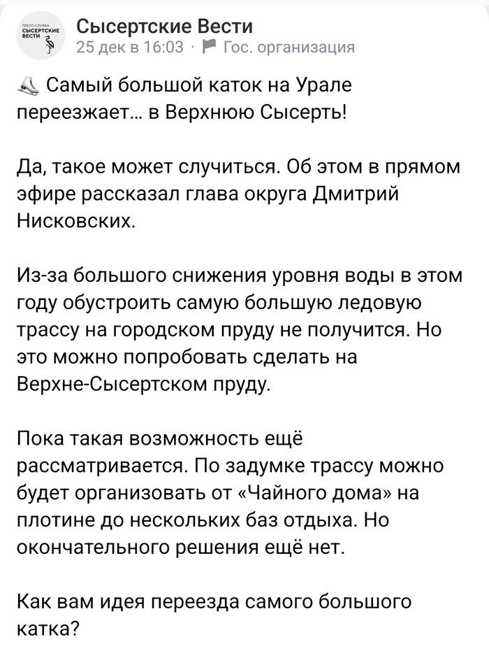 кто-нибудь знает, в этом году чистили ли трассу под коньки на сысертском пруду?