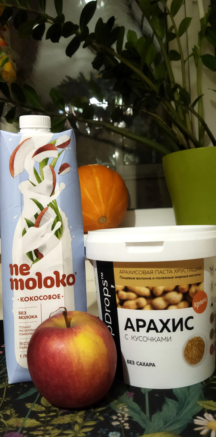 2 ложки ореховой пасты, яблоко и кофе с кокосовым молоком).