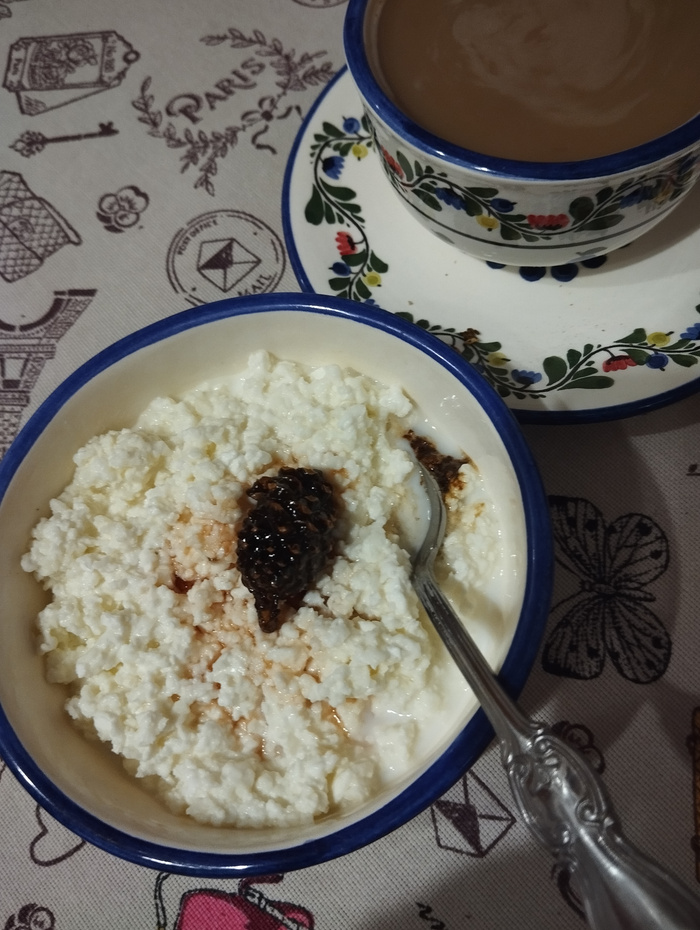 С утра творожок горячий из обрата с шишкин ым вареньем и бутерброд со сливками