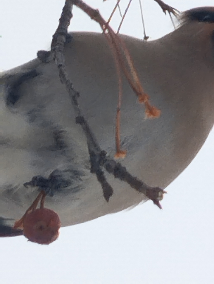Я засняла как на меня не боясь уселась свиристель.. К тому же она Калевала это яблоко и была повёрнута ко мне. Но она быстрее ест, чем телефон фотографирует. И хохолок чуть видно