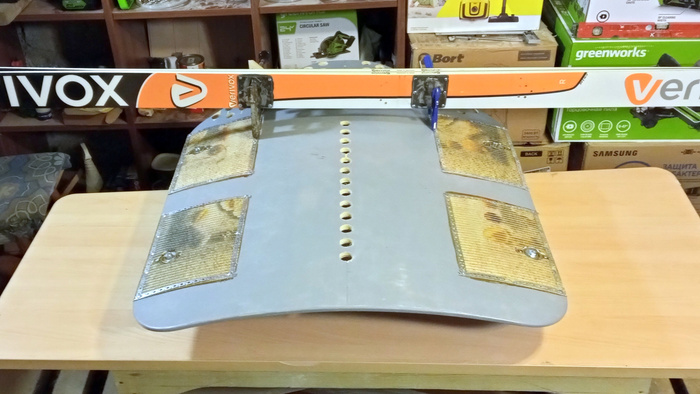 К зиме 2024 – 2025 у меня случилось озарение – чтобы не пропускать полгода, надо попробовать тренироваться на льду. Во первых, зимой гораздо больше свободного времени. Во вторых, для начинающих зимой проще осваивать, нет фактора воды, волн и неустойчивости доски. И как оказалось, тема зимнего виндсерфинга весьма давно популярна и энтузиастами наработан приличный опыт – можно пойти по проторенной дороге. Изучив тему, нашел на авито старые советские прыжковые лыжи для трамплинов и соорудил «снаряд» из подручных остатков строй материалов. Всего затрат около 6 тыс.руб.