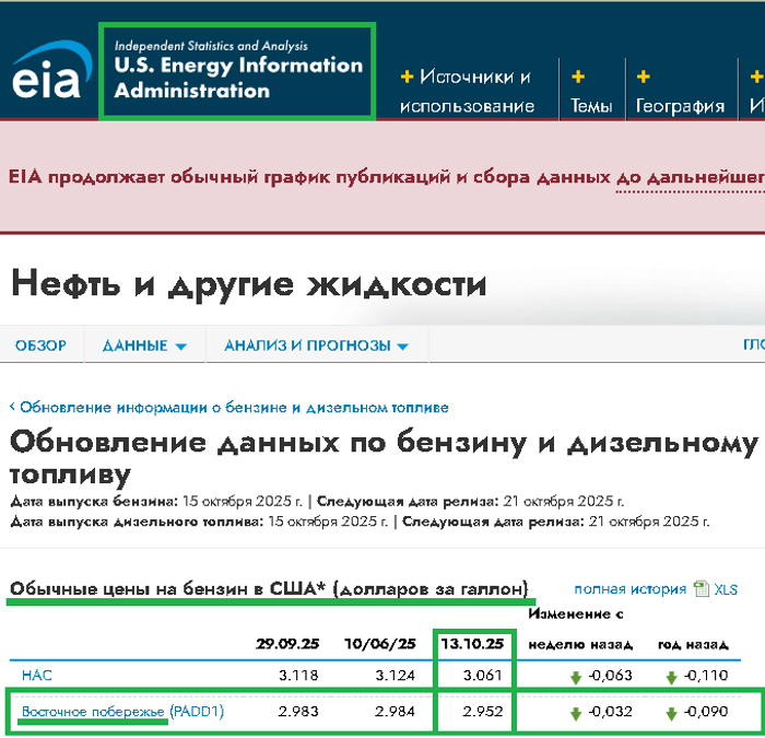 Стоимость моторного топлива за галлон на Восточном побережье US от Управления энергетической информации US за 13.10.25.