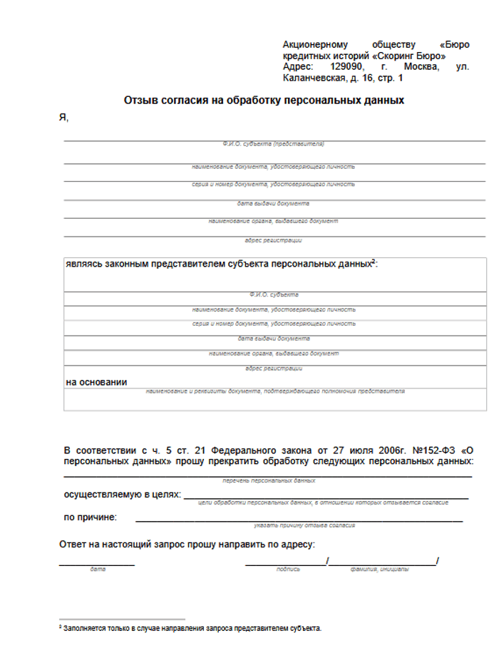 Для того, чтобы отозвать согласие на обработку персональных данных, необходимо направить в Бюро заявление об отзыве согласия на обработку персональных данных. В заявлении необходимо указать фамилию, имя, отчество, паспортные данные, цели обработки персональных данных, в отношении которых отзывается согласие или вы можете воспользоваться готовым шаблоном заявления об отзыве.