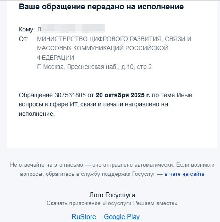 Минцифры России рассмотрело Ваше обращение от 10.10.2025
