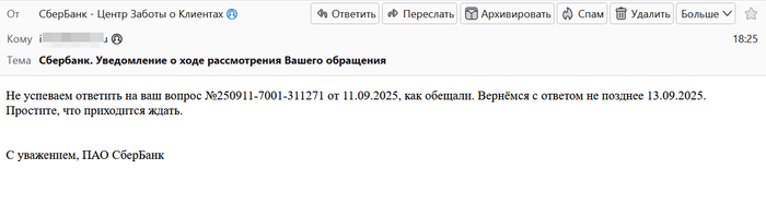 Не успеваем ответить на ваш вопрос №250911-7001-311271 от 11.09.2025, как обещали. Вернёмся с ответом не позднее 14.09.2025. Простите, что приходится ждать.