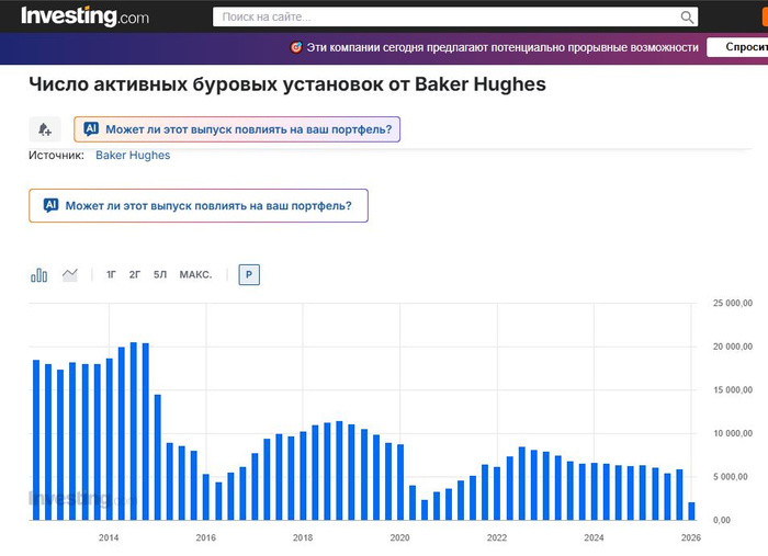 Причина — из-за низких цен на нефть компании в США сокращают количество активных буровых установок, а также инвестиции в разведку и бурение новых скважин.