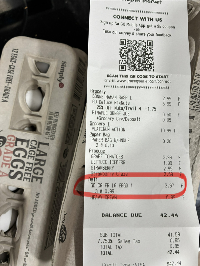 Все проще. Парикмахер зайдя в магазин увидел (и возможно купил) яйца в Кировском по 79 руб. И сообщил об этом. Я их тут увидел в обычном супермаркете дешевле, чем в Екатеринбурге. По акции. Вывод можно сделать такой: куриные яйца в Сакраменто стоять примерно одинаково с Екатеринбургом. Не согласен?