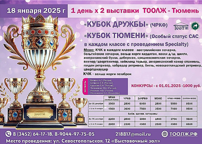 В связи с повышением взносов с 1 января 2025 года в РКФ за оплату выставок, мы будем вынуждены значительно поднять экспонентский взнос за регистрацию выставки. Кто желает принять участие, пожалуйста, поторопитесь.