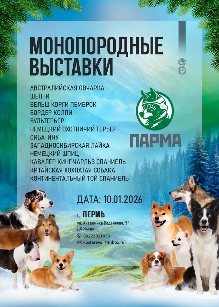 В Рамках рейтинговой выставки пройдут 12 монопородных выставок: австралийская овчарка, шелти(Гаврилова Я.А.), вельш корги пемброк, бордер колли(Гаврилова Я.А.), бультерьер(Гаврилова Я.А.), немецкий охотничий терьер(Гаврилова Я.А.), сиба, западносибирская лайка(Гаврилова Я.А.), немецкий шпиц. кавалер кинг чарльз спаниель, китайская хохлатая собака(Гаврилова Я.А.), континентальный той спаниель.