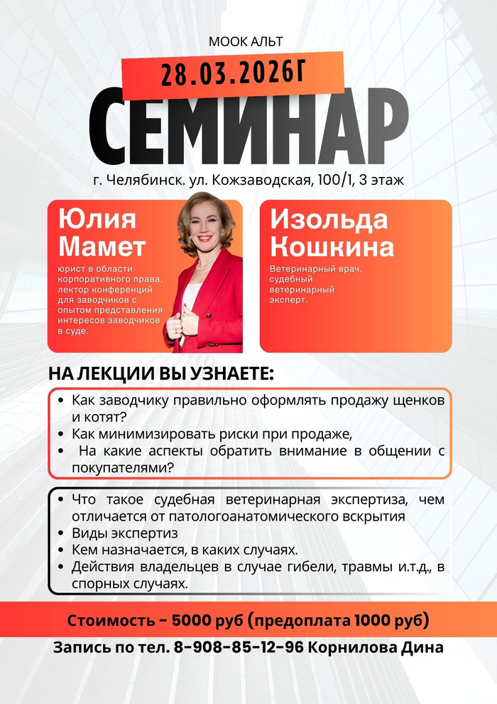 Лектор поделится своими знаниями в области оформления и регулирования деятельности заводчика, расскажет об особенностях продажи животного и решениях спорных вопросов с покупателями, разберет важность соблюдения требований по племенному разведению при осуществлении деятельности и поделится опытом, полученным при представлении интересов заводчиков собак и кошек в судах.