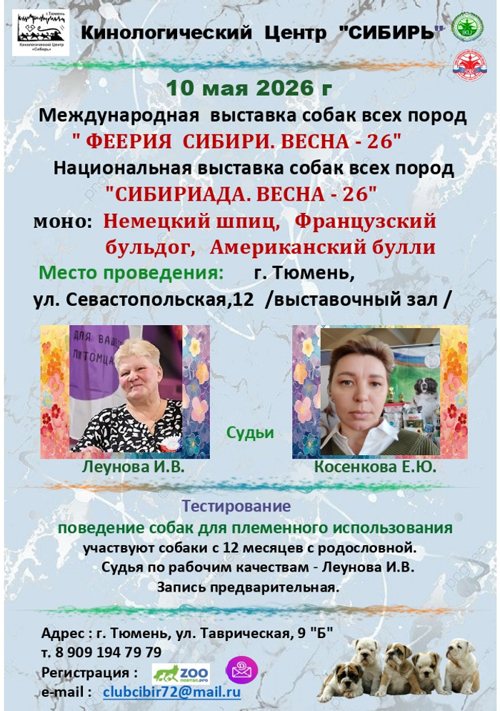 СКОР 10.05.26г Тюмень КЦ "СИБИРЬ" CACIB+CAC+ МОНО Франц.бульдог,Шпиц,Булли +ТЕСТИРОВАНИЕ