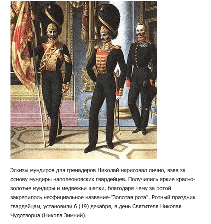 "Желая ознаменовать особое Моё благоволение к тем нижним чинам Лейб-гвардии, которые на Отечественной войне оказали своё мужество и во все продолжение их верной службы до самого истечения срока отличали себя усердием, Я признал за благо учредить из них при Дворе Моём особую роту под названием Дворцовых Гренадер, с тем, чтобы они были обеспечены в своём содержании на всю жизнь и чтобы служба их состояла только в полицейском надзоре во Дворцах, где будет Мое пребывание ..."