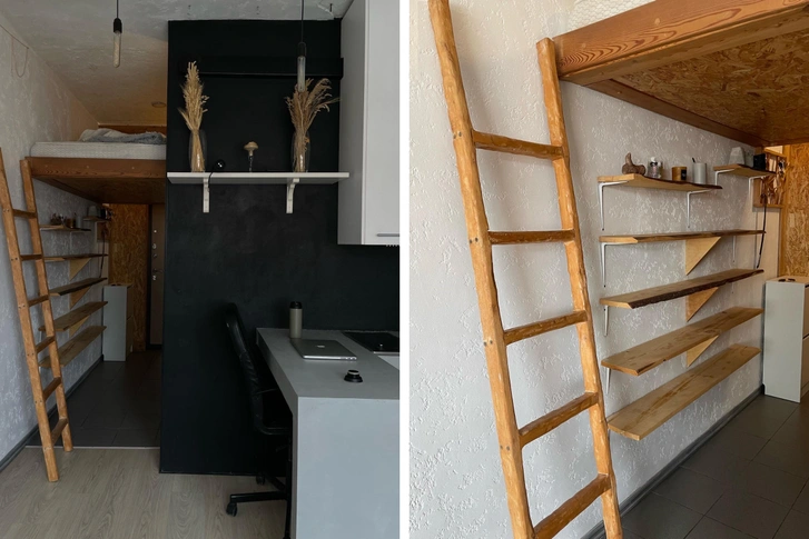 Здесь кровать под потолком в прихожей, а вокруг окна огромный шкаф — ремонт и мебель делали сами вручную
