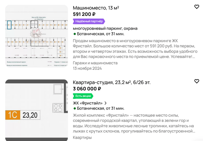 Есть многоуровневый паркинг, который можно приобрести в собственность. Но цена составляет почти половину стоимости студий.