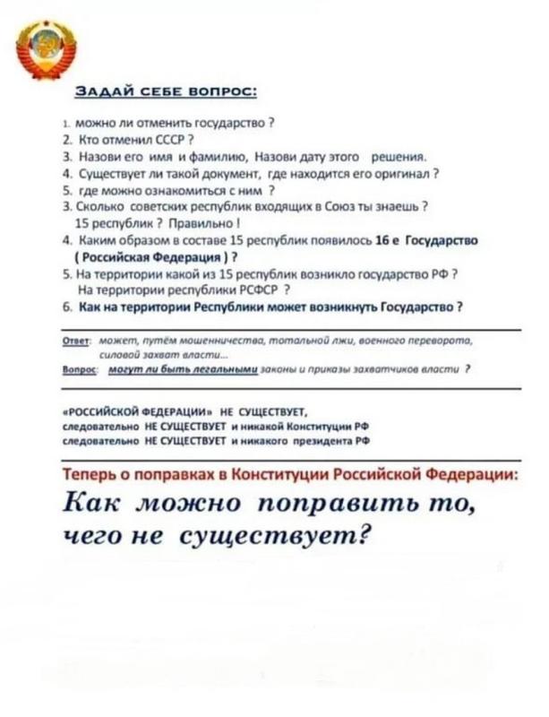 Ну пускай тогда докажут подтвердив свидетельствами (документами) правопреемственость и переход земель и достояний общеНаРОДной собствености с баланса СССР/РСФСР к юридической фирме рэфляндия, иначе только невеждам, ротозеям и слабоумным поверится их крИвда звучащая чрез ими купленые Средства МАЦАвой Иудаизации.