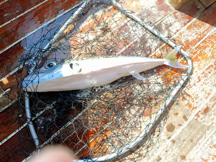 Дык, эта, на кораблике филе скумбрии на обед готовили, с салатиком и спагетти в томатном соусе.Фугу оставили на обед недоброжелателям, но потягать такой вес с глубины интересно, выкачивание палкой помогает, чтобы катушку провернуть,