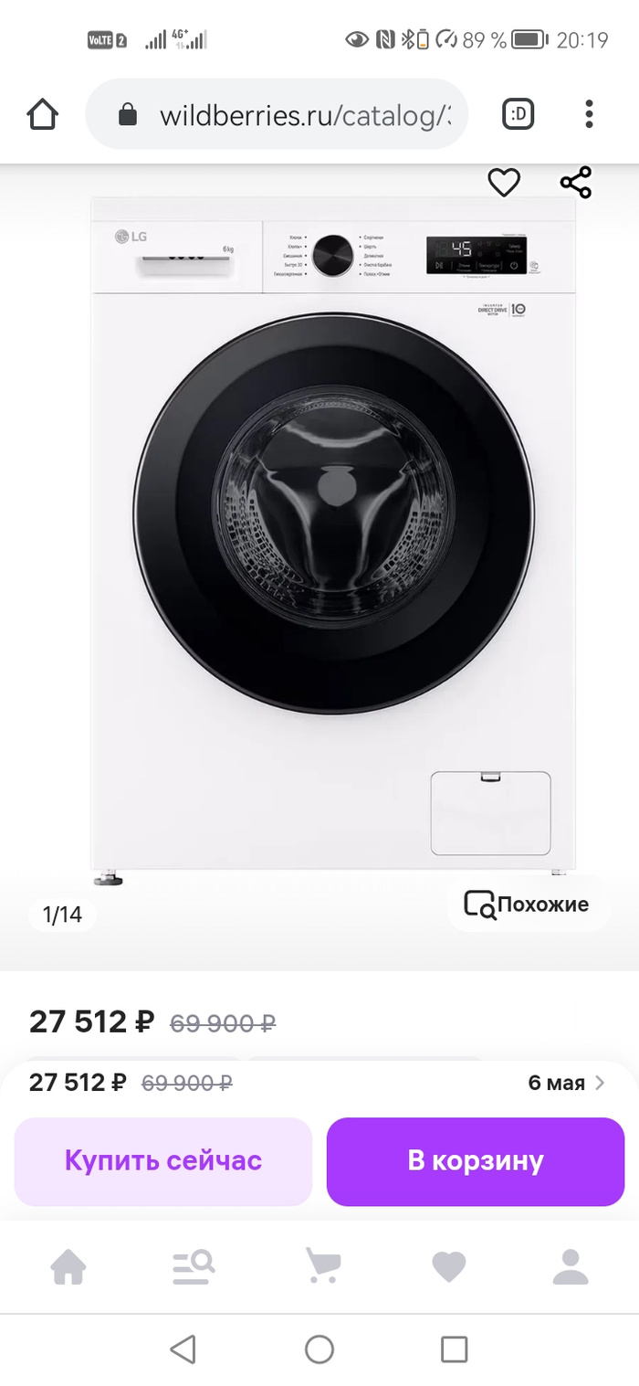Тем временем цена на стиралку LG с прямым приводом из 2020 года на вб, топ предложение.